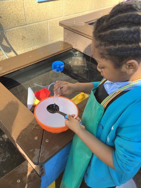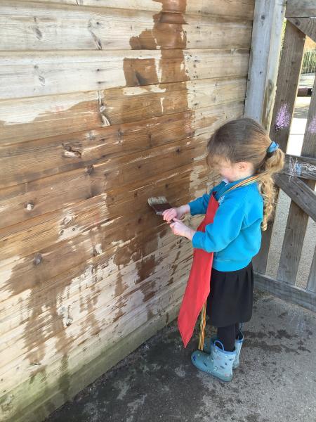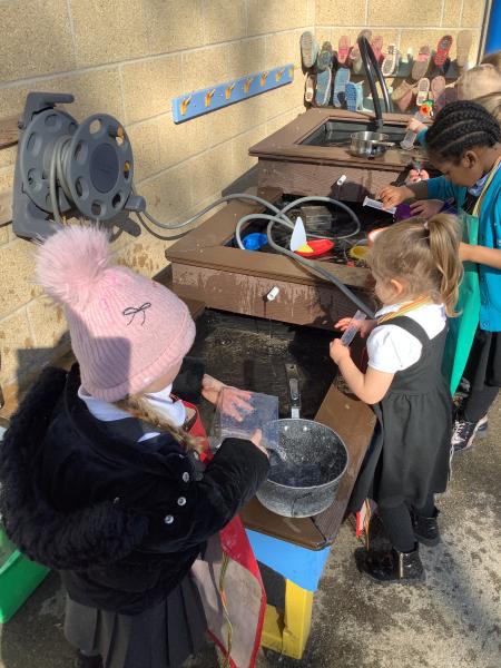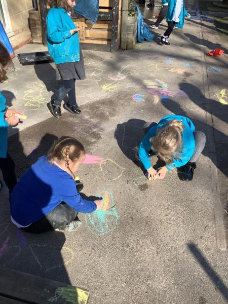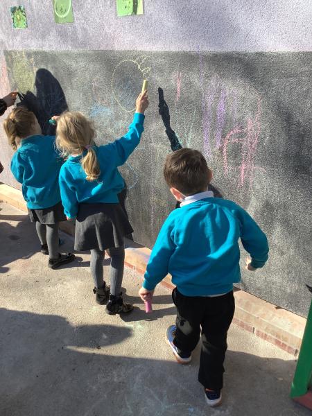 The sun has been out for us this week, so we have made the most of spending lots of time outdoors. We have explored the water area and drawing butterflies with chalk on the ground and walls. The children have loved this!